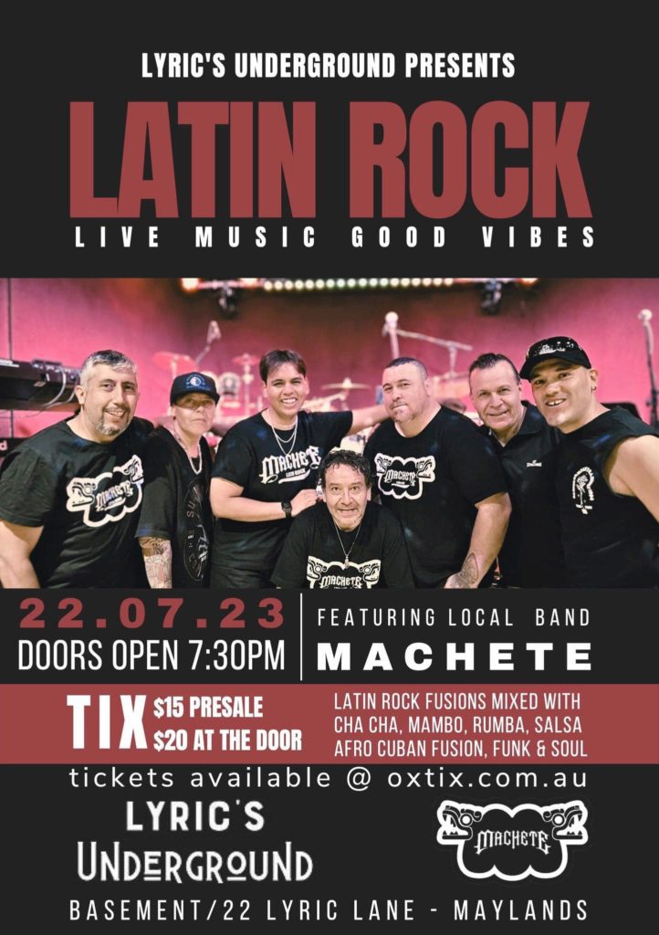 ¡Prepárate para una noche llena de rock y energía desbordante con la banda principal de Perth, Machete! Ellos están listos para hacer temblar los cimientos de Lyric Underground con su inigualable sonido de rock latino.