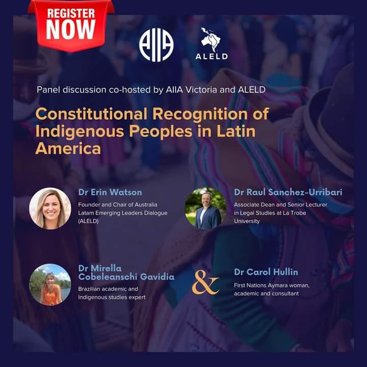 AIIA Victoria y el Diálogo de Jóvenes Líderes Australia-Latinoamérica (ALELD) te invitan a unirte a nosotros en esta importante y oportuna discusión de panel para jóvenes profesionales sobre el reconocimiento constitucional de los pueblos indígenas en América Latina. Nuestro panel de expertos profundizará en los desafíos, avances, oportunidades y lecciones de la experiencia latinoamericana.